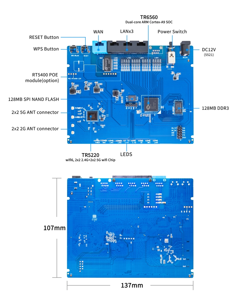 Banana Pi BPI-WiFi 6路由器采用Tripuctor TR 6560 + TR 5220 wifi SOC设计,是一款标准的WiFi 6路由器解决方案。内置高性能双核ARM Cortex-A9处理器,可用于WiFi消息转发或智能业务处理,内置高性能LSW和硬件NAT,支持最高5Gbps消息转发,集成5*GE PHY,提供1000 Mbps网络接入能力,支持两个WAN端口。支持硬件智能QoS。支持双频2.4G 40M 2*2 + 5G 160M2.2 DBDC WiFi,Wifi协议版本支持到IEEE 802.11ax,向下兼容802.11a /b/g/n/ac,可支持最高速率3Gbps,2G将达到573.5Mbps,而5G将达到2401.9Mbps,支持PoE接口,增加PoE模块支持PoE功能。